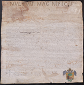 .1568.. MANUSCRITO: .(FAMILIA GARAY).. .DECLARACIÓN DE REPARTO DEL PATRIMONIO DE LA FAMILIA DE LOS GARAY.. Manuscrito sobre pergamino de 60 x 60 cm. Firmado en Cesaraugusta (Zaragoza) ante el notario público Juan Morellan el 17 de marzo de 1568....