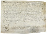 .1605.. MANUSCRITO: .(PERGAMINO-ALT URGELL).. .DOCUMENTO NOTARIAL REFERENTE A UNA ACTA DE ESTABLECIMIENTO DE UN VILAR A FAVOR DE JOANI VILAPINYO.. Texto en latín. 30 x 40 cm. Acta de establecimiento en un Vilansat a favor de Joani Vilapinyo agricultor de Organyani. Signum notarial de Jacobi Joanis Mestre de la Villa de Castellboni, 1605.