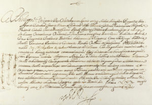 .1633.. LIBRO: .(FIRMA REAL).. .DOCUMENTO CON LA FIRMA REAL DE FELIPE IV.. Pliego de 2 h., papel verjurado de época. Redactado en latín lleva la firma manuscrita ´Yo el Rey´ de Felipe IV y la del secretario Hierónimo Villanueva. Firmado en Madrid el 8 de enero de 1633.