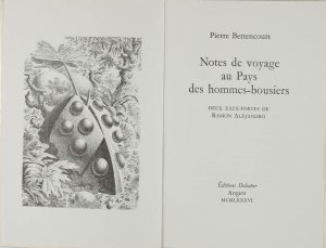 BETTENCOURT Pierre.Notes de voyage au pays des hommes-bousiers. Deux eaux-fortes de Ramon Alejandro. Angers, Deleatur, 1986. In-8, br. 1/600 ex. de l’édition courante.Joint :- Jean SADINET (Pierre BETTENCOURT). Les plaisirs du Roi. Paris, Losfeld,...