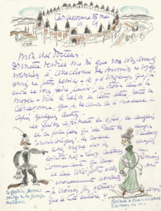 qu’il illustre de dix dessins aquarellés : les remparts, qui entourent le lieu et la date, le train qui s’en va, à la fin de la lettre, et 8 personnages légendés : le gardien, un spécimen de cassoulet adulte, une des dernières châtelaines, un agent de police de la ville basse, une figure de vitrail, la B.14 gothique de l’Hostel de la Cité, un soldat de l’armée d’occupation et un indigène. Les guides racontent les origines lointaines de la Cité, mais Bofa croirait « plus volontiers que la Cité entière, y compris les parties romaines et wisigothes, fut bâtie par Viollet-le-Duc, environ 1840. C’est d’ailleurs tout à l’honneur de ce poëte romantique, car elle est ingénieusement machinée, et d’une grande solidité, puisqu’elle s’est gardée intacte jusqu’à nos jours ». Mais le tourisme s’y est mis : « sur les vestiges authentiques du XIXe siècle, commencent à pulluler des vestiges tout neufs, à usage d’hôtel, de magasins ou de tea-rooms, d’un style gothique-flamboyant, d’ailleurs inconnu dans la région »… Cette partie de la ville « rappelle assez Lourdes, avec la foi en moins ». La nuit, la Cité reprend « sa pure et majestueuse silhouette de décor d’Ambigu ». Dans la ville neuve « qui date seulement de St Louis » bâtie sur le modèle des villes américaines, on rencontre « en abondance des soldats annamites en armes [2 bataillons de tirailleurs indochinois étaient en garnison à Carcassonne], une importante quantité d’agents de police au mètre carré, et une infinité de médecins » ; c’est sans doute « à cause de ce climat merveilleux, et pour leur propre santé, que tous les médecins habitent à Carcassonne »….On joint une L.A.S. de Joe BRIDGE à l’en-tête des Ateliers Joe Bridge, avec un dessin représentant un Breton en chapeau, assis à un bar devant une rangée de verres et levant un poulet fumant au bout d’une pique, et une lettre dactylographiée à M. Levy Oulmann, 8 octobre 1932, à en-tête Le Bon Petit Diable, Théâtre gai des enfants, avec au verso un dessin à la plume signé « Joe ».