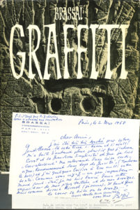 Minotaure, 1933], « où la pensée – combien tâtonnante et boiteuse – anticipa pourtant l’art nouveau et la rupture […] intervenue dans notre sentiment esthétique. Je suis moi-même un peu étonné comment en 1933 la fréquentation du mur et l’emprise des graffiti pouvaient m’inciter à écrire […] ces lignes “prophétiques” ». Il est ravi d’avoir vu chez lui « toutes ces belles choses si proches à ce que j’aime » … 2 mars 1968. « Cher ami, j’ai été très très touché par votre gentillesse. Et votre livre si beau et si réussi m’a fait d’autant plus plaisir que j’adore Corot et sa grandiose simplicité et que je suis “convalescent” me relevant d’une crise cardiaque heureusement sans trop de gravité »… C’est donc un peu imprudemment qu’il s’est lancé dans cette exposition de ses pièces taillées et de ses bronzes : « mais comme disait Rivarol […] “Il faut que le cœur se brise ou se bronze” »….On joint le livre de Brassaï, Graffiti (Les éditions du temps Paris 1961), avec dédicace a.s. : « Pour Jacqueline Selz et Yvon Taillandier ce voyage de l’œil sur les murs de Paris. On ne peut plus amicalement Brassaï Paris, le 24 novembre 1961 ».