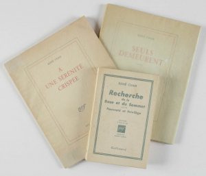 CHAR René.Seuls demeurent. Paris, Gallimard, 1945. Pt in-4, br. Mention d’édition.Joints :- A une sérénité crispée. Paris, Gallimard, 1951. Pt in-4, br.- Recherche de la base et du sommet (…). Paris, Gallimard, 1955. In-12, br.