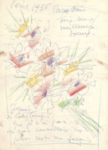 1956. Lettre de vœux, avec dessin d’un beau bouquet qui prend toute la page. Il pense souvent à eux, même s’il n’a pas de leurs nouvelles : sont-ils toujours à Boston ? Il travaille beaucoup, et les embrasse… [Janvier 1962]. Vœux : 2 dessins aux crayons gras de couleurs, bouquet offert « À mon pote Berbérian »… [19 août 1962], carte postale de Biarritz, annonçant sa venue à Paris … Paris 5 septembre 1962. « Mon pote […] Je m’aperçois que tu t’organises bien dans ton galonnage [….] Quant à mezigue, une virée à Genève ! […] Ici le trêpe radine, la bousculade. Fini la douceur du mois d’août. En plus il flotte. Le terrain est lourd. Comme qui dirait c’est la joie du militaire »… Genève 17 octobre 1963. Il s’ennuie à Genève : « c’est pas mon genre. Faut être indigène pour encaisser. – pour la vie nocturne, lapuche […] quant à la converse, un peu lourdingue »… [9 janvier 1964]. Envoi de la couverture de Paris Match, numéro spécial avec Paul VI en couverture, auquel il a dessiné des lunettes de soleil, et des cheveux frisés. Il a écrit à côté : « BER I »… Sur une page séparée, dessin : portrait de son ami aux crayons de couleurs, sur le nez duquel il a collé des lunettes en forme de cœur découpées d’un magazine, et accompagne de ce slogan : « L’irrésistible La lunette en cœur, gros succès garanti » ….1965. Limoux 21 mai. Il peut enfin « bouger la pogne » et en profite pour lui écrire. Il va repasser une radio et a « un rebouteux masseur » qui vient le voir, « c’est vachement douloureux ». Il commence à récupérer quelques mouvements, et en profite pour « faire la cure. Repos, régime ». Il ne se plaint pas de son hospitalisation, il est le « gros maque de la sécurité sociale tous les avantages du prolo organisé. Le grand jeu. […] Vive la sociale et la fracture de l’humerus ». Il bénéficie d’aides de toutes sortes : « un vrai nougat »… 9 juin. Il a reçu les nouvelles des « potes Berberes », bien grises et tristes : « de la vraie misère. Faut-il que le gisant vous remonte le moral ». Il suit sa rééducation, mais l’épaule est toujours ankylosée et ça sera assez long, il s’exerce à descendre et monter les escaliers, demande des nouvelles des enfants, surtout de Michel [le futur artiste Michel Berbérian, son élève]… 25 juin. « Alors toute la famille de Boulogne sur Seine laisse tomber le martyr de Limoux ? ». Il va quitter la clinique pour continuer la rééducation : « c’est vachement douloureux »… .Envoi d’une annonce d’emploi découpée dans un journal : « Jean, je me suis renseigné, tu as tes chances. Les postulants chauves sont éliminés »… Coupure de presse avec photo d’un parachutiste , encadrée et coloriée au crayon gras, sur laquelle il a noté : « papa Berbérian ». Dessin d’une carte de France au crayon gras bleu, coloriée en rose dans laquelle il a noté : « Le duc du TOUR », signé Gen-Paul… Dessin au crayon gras d’une rose, signé GP, sur lequel il a noté : « Gritiche, Bonsoir »… Plus des cartes (postales, vœux, etc.), 1966-1969, dont 2 avec reproductions de tableaux de Gen-Paul, et lithographie du bouquet rose et bleu (1962)..On joint 2 brouillons autographes, dont un au sujet de Céline, en réponse à un détracteur : « Il me serait jamais venu l’idée de vous traiter de délateur sans vous connaitre ». Son correspondant l’a traité de « collabo parce que étant ami de Céline. […] Lui a payé. Mes rapports spirituels avec lui n’avaient rien à faire avec ses idées. […] Quant à la haine pour moi c’est trop fatiguant. Marcel Aymé était mis dans le même panier. Céline jugé a payé il est mort reste son œuvre. En dehors de ses idées l’ami était de valeur et très fréquentable »…