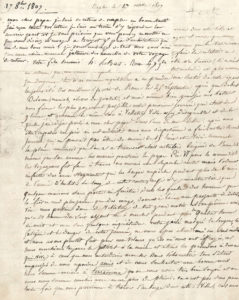 et son séjour à Naples et en Campanie..Parti de Rome le 25 septembre, avec des élèves de Girodet, sa première journée de voyage l’a amené à Velletri « ville assez désagréable » ; ils ont ensuite traversé les marais pontins, fort insalubres et dangereux : « nous marchions toujours le pistolet à la main et étions les premiers à demander Qui vive à ceux que nous entendions marcher dans l’obscurité » ; ils sont arrivés à Terracina où ils ont passé trois jours, très bien traités. Malgré la présence de brigands, ils ont continué leur route avec « 4 voitures de rouliers qui nous servaient d’escorte » et sont arrivés à Gaëte « ville forte du bord de la mer qui, fut prise il y a neuf mois par les français », d’où ils ont gagné Capoue, où ils ont visité « les ruines de l’ancienne Capoue, qui consistent en un arc de triomphe et un amphithéâtre ». Après un arrêt à Caserte, palais « de la plus g[ran]de magnificence », ils sont arrivés à Naples à pied, le 5 octobre. Dès le lendemain, ils sont allés « entendre à l’opéra bouffon de charmantes musiques » ; ils ont visité la ville, sont allés au théâtre français : « on y donnait la Métromanie et les fausses infidélités » mais très mal jouées. Il a demandé une permission pour pouvoir visiter et dessiner Pompéi. Il a vu la côte et le Pausilippe, le palais de la Reine Jeanne, le théâtre royal de St Charles, le couvent des Camaldules, est monté au Vésuve, a fait le voyage de Paestum et de Salerne. Il doit encore aller à Baya, et ne peut donner par écrit une idée de la beauté des lieux… Etc.