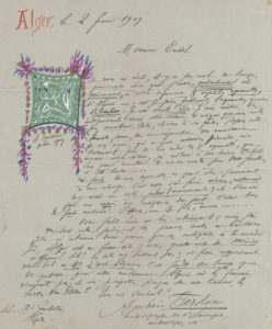 Ambroise TARDIEU (1840-1912) historiographe de l’Auvergne, peintre et archéologue. L.A.S. avec aquarelle, Alger 2 février 1909, à Paul Eudel ; 1 page in-4..Joli document orné d’une belle lettrine d’inspiration algérienne. « Je vous ai...