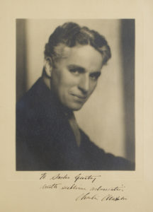 Charlie CHAPLIN (1889-1977). Photographie avec dédicace autographe signée ; 33 x 25 cm à vue, encadrée...Belle photographie en buste, dédicacée à Sacha Guitry : « To Sacha Guitry with sublime admiration Charlie Chaplin ».