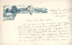 très bref aperçu..La plupart est adressée au journaliste Jacques Patin (1883-1948), rédacteur en chef au Figaro et chargé du supplément littéraire. Parmi les autres correspondants de Juliette Adam, son amie Julia Daudet, femme d’Alphonse, Arthur Meyer, directeur du Gaulois, Jules Claretie, Mme Arvède Barine, P.B. Gheusi, Jean Bernard, à un ministre, etc. Il est beaucoup question de La Nouvelle Revue, fondée et dirigée par Juliette Adam (beaucoup de lettres sont à l’en-tête de la revue), et des réunions qu’elle organise dans son domaine de l’Abbaye à Gif-sur-Yvette, d’où sont écrites beaucoup de lettres, ainsi que de Paris, ou de sa villa des Bruyères dans le Midi ou de Callian (Var), mais aussi de Marseille, Nice, Cabourg, Rome, etc..Dans une première lettre, signée « Juliette Lamber » (vers 1850), elle dit être encore sous la tutelle de son père. En novembre 1870, elle s’écrie : « Ah, les maudits Prussiens ; si j’en pouvais faire sauter 500 mille »… En 1878, elle appelle de ses vœux la création d’un « muse ethnographique »… Elle s’enthousiasme devant un portrait de son ami Henri Rochefort (1879). Le 20 mai 1889, elle annonce à Julia Daudet qu’elle va fonder sa « revue dirigée par une femme », et aimerait y publier un roman d’Alphonse Daudet ; elle reviendra souvent à la charge. À partir de 1902, il est question de la préparation et la publication de Mes souvenirs (1902-1910, 7 vol.)… Pendant la guerre de 14, elle se montre ardente patriote. La correspondance avec Patin est très abondante dans les années 1920. Elle parle notamment des attaques contre elle venant de Léonie Léon, la maîtresse de Gambetta : « ayant refusé d’être franc-maçonne je serai brisée j’en ai eu la menace franc-maçonnique »… Etc.