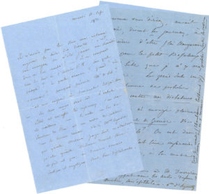 régulièrement et aimerait aller le voir. Louis de Ronchaud est « tout attristé » de cette captivité. Puis elle lui donne « q.q. nouvelles privées : Moi (toujours moi en première ligne), santé parfaite » et parle des personnes qu’elle fréquente à Divonne. « Le grand Jules du Jura continue de protester par lettres contre nos dictateurs ». Elle lui a envoyé des numéros du Journal de Genève. « On est dans cette place, fort bien informés et bien pensant, à la mode de Berlin »....« Je n’avais pas lu sans une certaine angoisse la liste des désastres ! c’est bien ennuyeux de n’être jamais en sécurité dans ce bas-monde ! ». Elle lui demande des éclaircissements sur l’histoire V.R. Elle a apprécié l’article de Littré, « l’un de ses meilleurs », et parle de Mme Lagardie « qui exécute Madame George Sand en attendant qu’elle exécute Madame Daniel Stern ! Le fait est que ces derniers romans érotiques et mystiques sont bien déplaisants ». Elle ne sait rien des changements ministériels et croit à l’alliance prussienne. Puis elle évoque la vie à Divonne : « la musique que vous savez à l’extrémité du village, du côté par où vous arrivâtes. L’oiseau à l’autre extrémité du côté de Ravelloles. Entre deux, le populaire, la bourgeoisie encrinolisée, et la Comtesse... l’Impératrice, disait-on. Les jardins du chateau ouverts au public, des gâteaux, du vin blanc à bouche que veux-tu ? » ; brouille entre le préfet et le conseil-général....On joint une L.A.S., 20 mai 1866, au docteur Bertrand, médecin inspecteur des eaux (2 pages in-8, enveloppe). C’est Louis Tribert, porteur de cette lettre, qui est chargé de rapporter des nouvelles et de lui dire « si vous avez guéri la dame de Rheims (mélancolique). Quant à moi, je suis peut-être trop guérie, puisque je n’ai plus de prétexte pour aller à Schlangenbad »... Plus un tiré à part sur la corresp. Agoult-Tribert.