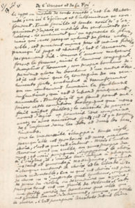 proprement dit est le sentiment qui en approche le plus. « La maternité échappe à toute règle, parce qu’elle est spontanée et sans aucun choix […] mais l’autre amour veut un culte au sens propre du mot », car il résulte d’un choix, « fruit de volonté » ; il faut de la volonté et « de la Fidélité pour bien jouer du violon, ou pour bien faire n’importe quoi, et certainement aussi pour bien penser. » Le plaisir de penser ne se conçoit pas sous la contrainte, « de même sous le serment on ne peut connaître le plaisir d’aimer. […] La Foi se passe de preuves. En toute action, il faut vouloir et croire. La Charité est un amour entièrement voulu, que porte l’Espérance, mais c’est la Foi qui porte les deux. Et la Foi est de volonté en quoi elle s’oppose à la croyance, qui n’est que de nature ». Il reste que « la Maternité représente le mieux toute la perfection possible de nos sentiments et même de nos pensées. Et il y a une parenté profonde entre les sentiments religieux et les sentiments familiaux »… etc. .Une bande de papier collée à la fin de la lettre dissimule quelques lignes d’envoi de ce « deuxième chapitre ».