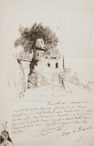 Roger de BEAUVOIR (1809-1866). L.A.S. avec dessin, [janvier 1863], à des amis ; 1 page in-8 (19,5 x 13 cm ; encadré)..Lettre illustrée d’un grand dessin à la plume : pittoresque maison perchée sur un rempart. Il explique à ses « bons...
