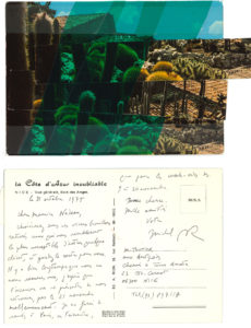 Michel BUTOR (1926-2016). 2 L.A.S. avec collages, Nice octobre-décembre 1975 ; 1 page oblong in-8 chaque au dos d’une carte postale illustrée avec collage..31 octobre 1975, à Maurice Nadeau. « Choisissez dans ces vieux brouillons raturés...