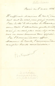 François-René de CHATEAUBRIAND (1768-1848) écrivain. L.S., Paris 5 mars 1846, [au comte de Ségur ?] ; demi-page in-8..« Il suffisait […] d’un seul mot de vous pour que je reçusse l’ode de Mr le chevalier de Lacoux avec toute...