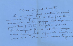 COLETTE L.A.S., à Charles et Lucette Dignimont ; 1 page et demie oblong in-8 sur papier bleu..Elle a mal à la jambe et ne sort pas, « mais le bouquet fleuri et les vœux nous raniment. Quand vient-on nous voir ? On vous aime toujours et on...