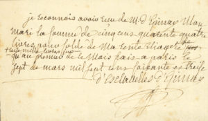 Louise-Florence Tardieu d’Esclavelles, marquise d’ÉPINAY (1726-1783). P.A.S., Paris 7 mars 1778 ; 1 page oblong in-8..Elle reconnait avoir reçu « de M. d’Epinay mon mari la somme de cinq cent quarente quatre livres pour solde de ma rente...