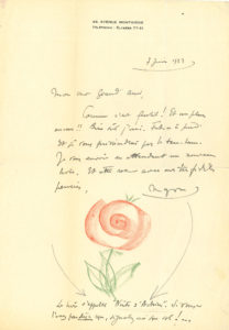 Michel GEORGES-MICHEL (1883-1985). L.A.S. « Mgm » avec dessin, Paris 7 juin 1933, à un « grand ami » ; 1 page in-4 à son adresse (petite fente au pli)..Il remercie d’une invitation où il se rendra : « Fut-ce à pied ». Il dessine...