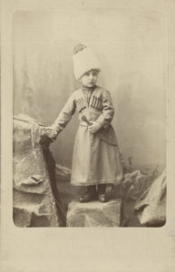 [Sacha GUITRY]. Photographie originale, [Saint-Petersbourg 1889-1890] ; 17 x 11 cm, sur carte à la marque du photographe au dos..Très rare photographie du jeune Sacha, âgé de quatre ans et demi, costumé en cosaque, par Wapuro à...