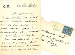 Guy de MAUPASSANT. L.A.S., [Paris 2 mai 1883], à Maurice Sand à Passy ; 1 page et demie in-12 à ses chiffre et adresse 83 rue Dulong, enveloppe..Il est désolé de cette « déveine acharnée » mais il est « contraint de partir demain pour...