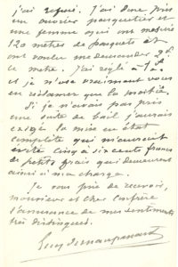 de son correspondant, il lui envoie « la note des carreaux qui étaient cassés, des nettoyages qu’on m’avait dit insignifiants tandis que j’ai trouvé les parquets criblés de taches et pleins de poussières anciennes »… Il a engagé pour ces travaux un ouvrier parquetier et une femme « qui ont mesuré 120 mètres de parquets […] J’ai réglé à 1f le mètre et je n’ose vraiment vous en réclamer que la moitié. Si je n’avais pas pris une suite de bail j’aurais exigé la mise en état complète qui m’aurait évité cinq à six cent francs de petits frais qui demeurent ainsi à ma charge »…