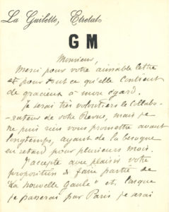 puis rien vous promettre avant longtemps, ayant de la besogne en retard pour plusieurs mois. J’accepte avec plaisir de faire partie de “La nouvelle Gaule” et, lorsque je passerai par Paris je serai heureux d’assister à quelqu’une de vos réunions »…