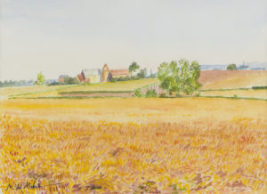 Michel MOHRT (1914-2011). Aquarelle originale, signée en bas à gauche ; 25 x 34,5 cm à vue (encadré)..Paysage champêtre, avec champs, ferme et bosquet d’arbres.