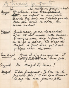Puisatier. Belle et la Bête Acte II ». Il comporte : – la fin de La Fille du Puisatier, scène « À travers la porte » entre Mazel et Pascal ; – le brouillon d’une partie de la première églogue, dans une version très différente du texte définitif, certains passages figurant en plusieurs versions, plus des notes diverses ; – le plan d’une pièce en quatre actes (personnages : Vernis et Florent...).