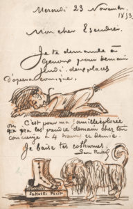 genoux deux places d’opéra-comique et se dessine (plume et crayon rouge) l’implorant à plat ventre et lâchant un énorme pet, ainsi qu’au bas de la lettre un chien léchant des bottines ; et le 26 novembre, il remercie et se dessine jouant de la clarinette donnant la sérénade à son ami. – Il croyait que Saint Georges lui enverrait deux places pour la Reine de Chypre (Fromental Halévy, 1841), « mais il parait que je ne suis bon que pour faire tout au plus des insertions. Je suis tellement indigné contre vous que si je me portais mieux je vous rouerais de coups » : dessin aquarellé de deux hommes en train de lutter, les manches retroussées.
