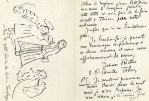 qui avait défendu son projet pour la tombe de Villiers de l’Isle-Adam.].10 août 1908, envoi d’un article du Matin, sur la bagarre mortelle entre deux rôdeurs, « deux loups » qu’il dessine avec la légende « Les deux loups décidèrent d’en venir aux mains, etc. etc. Pour le Sottisier ». 10 mars 1911 : il voudrait vendre ses « dessins de Rodin (si légers) Avec ce viatique, je pourrais lâcher les poèmes que je polissais pour Comœdia » ; dessin (pour faire rire Thérèse, fille de Brou et sa filleule) « Cousot dans Paris ». 10 juillet 1911. Il s’installe Rue Camille Tahan et aurait besoin de plâtre et d’une glace d’occasion. 21 décembre 1911. Il ne sera pas là pour Noël mais a rencontré le Petit Jésus qui lui a donné un livre pour Thérèse. 5 septembre 1912. Il recherche « les notes et photographies sur Rosso [le sculpteur Medardo Rosso] que je vous avais remises pour éclairer la lanterne du père Bloy » ; il en a besoin pour un article pour Comœdia ; « je vous jure que je vais essayer de faire boire la goutte à Rodin. Oui, il va prendre quelque chose ! » ; il embrasse tout le monde même l’oiseau Fifi, qu’il dessine à la fin de la lettre face à son profil. 6 septembre, il a tout retrouvé : « A présent nous allons faire boire une grande tasse de chiendent à la grande barbe de l’hôtel Biron ». 20 décembre 1912. Il envoie un livre à Thérèse – avec dessin du Petit Jésus lui remettant le livre « Pour la petite Sainte de la rue Tourlaque ». 10 juillet 1914. Au sujet d’une lettre qu’il écrit à Henri Barbot à propos de son livre Paris en feu , « avec une énorme envie de rigoler (contenue) »…