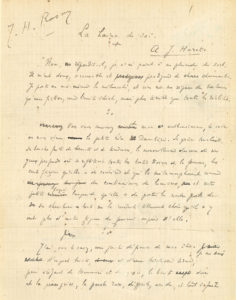 entre crochets les dates de publication). Ces manuscrits ont servi pour l’impression dans le journal, avec des marques typographiques au crayon bleu ; ils présentent des ratures et corrections..La haine de soi [27 septembre 1897, recueilli dans Le Coffre-fort, Rouff 1914], dédié à Jules Huret (6 p. in-4)..Le Destin [22 novembre 1897] (6 p. in-fol.)..Le Platonique [9 décembre 1897], dédié « Pour madame L. Lacour » (5 p. in-4, la fin manque)..Guitares [3 janvier 1898], (8 p. in-fol.)..Viviane [17 janvier 1898], dédié « A Madame F. » (7 p. in-fol.)..La Bonne Mort [31 janvier 1898], dédié à Mme Syamour (8 p. in-fol.)..Au Pays du Tendre [28 mars 1898], dédié « A Mme M. B. » (6 p. in-fol.) ; ce conte se rattache au cycle du « Club du Fumoir », avec le personnage reparaissant de Jacques-le-Taciturne..La Bergère [13 juillet 1900], dédié à Victor Tissot (7 p. in-fol.)..L’officier pauvre [22 octobre 1900] ; la dédicace a été soigneusement cancellée ; ce conte se rattache au cycle du « Club du Fumoir » (4 p. in-4 découpées pour l’impression et non remontées)..On joint un manuscrit autographe, plus tardif d’après le graphisme, sans titre, et dont la fin manque ; incipit : « Philippe m’attendait avec une impatience inquiète »… (8 p. in-4, avec ratures et corrections).
