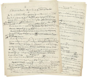 primitifs, en 2014 aux Moutons électriques..Le manuscrit, d’une minuscule écriture serrée, sur des feuillets recto-verso pour la plupart, numérotés de 1 à 91, est surchargé de ratures et corrections ; il présente également de nombreuses additions, entre les lignes (sur les dernières pages, les lignes sont très espacées pour permettre des développements) ou sur des béquets collés ou des feuillets supplémentaires. En haut de plusieurs feuillets, Rosny a inscrit le nombre de lignes, ainsi que les dates de relecture, du 12 juin au 31 juillet 1929..Le texte a été divisé en deux parties et en chapitres (la plupart non numérotés). I L’Énigme de la Préhistoire. – I L’Ancêtre des Ancêtres. Dans les Ténèbres du Tertiaire : « Quand vécurent les premiers hommes ? Quand l’Ancêtre des Ancêtres parut-il dans la profondeur des forêts ? »… – L’Aube du Quaternaire. – Les fiers artisans du Solutré, les étonnants artistes de la Madeleine. – Après la Madeleine jusqu’au Néolithique. – Les Époques du Cuivre et du Bronze. – II L’Âge du fer. – I L’Époque Hallstatienne. – Deuxième ép. du fer : époque de la Tène. – La religion. – Les Germains préhistoriques. – L’origine de l’homme..À la page 85, Rosny a collé un extrait de revue ; à la fin de la dernière page, Rosny a ébauché une conclusion pour résumer « l’esprit de ce livre », en renvoyant à a page 3.