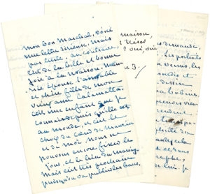 Maurice..9 mars. « Voilà le papier demandé, cher gros ami. Les portraits pâles sont bien venus, les foncés sont alourdis et nuisent à votre dessin autant qu’à ma bobine. Tâchez que les épreuves viennent moins, et rendent par conséquent la transparence et la simplicité du travail. Recommandez cela dans votre intérêt et dans celui du photographe, si la chose dépend de lui. […] Manceau m’a grondé de vous avoir grondé. Moi je sais que sa gronderie était affectueuse et rien de plus. Ce n’est pas un dessin qu’il veut, c’est que vous l’aimiez et que vous ne doutiez pas de son désir de vous obliger en toute circonstance.[…] Je travaille, je vous aime et je vous embrasse »….[Paris 28 mars]. « Samedi soir à la maison, hein ? Mon petit trésor y viendra-t-il ? Oui, oui, ohé ! – rue Racine 3 »..Nohant 2 mai : « voici une lettre sérieuse, mais pas triste. Au contraire, c’est de la belle et bonne joie à la maison. Maurice épouse l’aimable et chère fille de mon vieux ami Calamatta. C’est une enfant que je connais depuis qu’elle est au monde, et c’est le choix du cœur de Maurice et de moi. Nous ne pouvons encore fixer le jour, et le lieu du mariage. Mais c’est très prochain puisqu’on va publier les bans. Arrangez donc votre travail pour venir bientôt travailler ici. Vous savez que nous en serons tous heureux »....Correspondance, t. XVI, nos 9437 et 9470, et t. XVII, n° 9537.