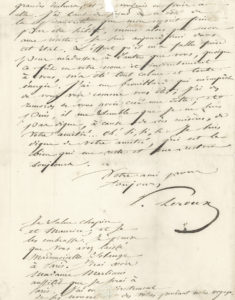 indépendante..La Châtre 11 juin 1841. Il a été voir Nohant et part quand elle arrive : « Ainsi veut le Destin, qui a réglé les rapports et conjonctions des astres errants dans le ciel et des âmes qui se cherchent sur la terre ». Il raconte son voyage dans le Midi avec son frère Jules. Ayant besoin d’argent et a sollicité Duteil : « J’ai dit que vous paieriez ma dette. […] Vous êtes le seul dont je ne doute pas »… Il salue Chopin et Maurice… – 8 septembre 1841. Il lui recommande Victor de Laprade qui va venir la voir. Il lui envoie son nouveau livre, pensant avec Mme Marliani « que le salut du monde ne peut se faire que par les femmes »… – 15 octobre 1841. Il vient d’achever la lecture d’Horace : « j’en suis ravi, très ravi. […] votre titre La Revue indépendante est admirable. […] Je savais bien que c’était vous qui seriez la marraine. Maintenant il faut vaincre ou mourir ». Il a fait composer le premier volume d’Horace, et parle de la correction des épreuves ; il attend Sand avec impatience : « Venez cimenter, affermir, perfectionner ce que nous avons ébauché, Viardot et moi, La Revue indépendante »… – [Juin 1844 ?]. « Avez-vous lu dans le National les curieuses lettre de S.M. Louis-Philippe ? Que dites-vous de ce Robert Macaire ? Amitiés à Chopin »….