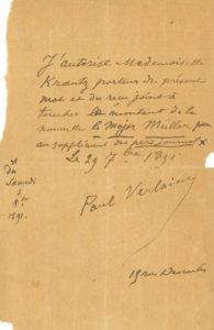 Paul VERLAINE (1844-1896). P.A.S., 15 rue Descartes 29 septembre 1891 ; 1 page in-8 (petite déchir. marginale sans toucher le texte)..« J’autorise Mademoiselle Krantz porteur du présent mot et du reçu joint à toucher le montant de la...