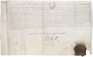 [VOLTAIRE (1694-1778)]. P.S. « Lebegue », Compiègne 7 août 1765 ; vélin oblong in-fol., cachet fiscal de la Généralité de Paris, sceau de cire brune partiellement brisé..Affaire Calas. Privilège royal accordé par Louis XV à la Veuve...