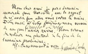 Émile ZOLA (1840-1902). L.A.S., à un ami ; 1 page oblong in-24 sur sa carte de visite à l’adresse de la Rue de Bruxelles..Il lui annonce son départ le lendemain pour Marseille, « avec le regret de n’avoir pu aller vous serrer la...