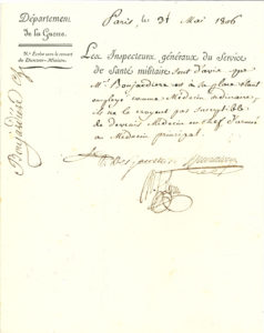 MÉDECINS MILITAIRES. P.S. par René Desgenettes, Nicolas Heurteloup et Dominique-Jean Larrey, Paris 31 mai 1806 ; demi-page in-4, en-tête Les Inspecteurs généraux du Service de Santé militaire..Ils pensent que M. Boujardiere « est à sa place...