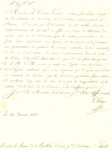 demande à son banquier de Florence « de verser immédiatement dans la Caisse du Trésor Impérial 400 000 f. que je vais faire transporter à l’Ile d’Elbe pour y rester en dépôt dans la Caisse du Payeur militaire qui n’en disposera que d’après mes ordres et suivant les besoins que les événemens pourront faire naître. Je veillerai dans tous les cas à ce que la comptabilité & les intérêts du Trésor de la Couronne n’en souffrent pas »…
