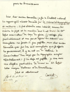Lazare CARNOT (1753-1823) mathématicien et homme politique. L.A.S., Paris 20 brumaire VII (10 novembre 1798), à un « cher ancien camarade » ; 1 page petit in-4 (contrecollée sur carte)..Il a fait le rapport demandé « sur le mémorial...