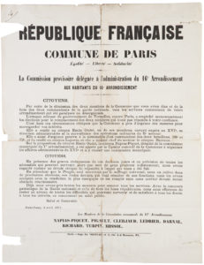 COMMUNE DE PARIS. Affiche, République Française, Commune de Paris, Commission provisoire déléguée à l’administration du 16e arrondissement aux habitants du 16e arrondissement, Paris-Passy 4 avril 1871 ; 61 x 48 cm, plis, fentes, trace...