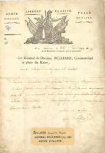 Campagne d’ÉGYPTE. L.A.S. et L.S. de généraux, Le Caire 1801 ; 1 page in-fol. chaque avec leur en-tête et vignette de l’Armée d’Orient, adresses avec contreseing..Auguste Belliard : l.a.s., 28 pluviôse IX, aux citoyens Lepère et...