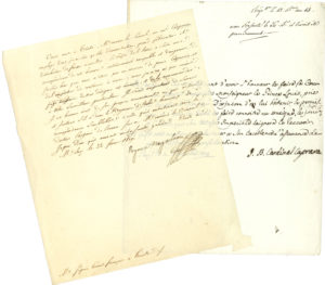 EMPIRE. 21 lettres ou pièces, la plupart L.A.S ou L.S..J.B. Bessières (Tilsit 1807), Guillaume Brune (et portrait), Cardinal Caprara (2 à Louis Bonaparte), Lazare Carnot (1815), Cuvillier-Fleury, Eugène de Beauharnais, baron Fain (2), Emmanuel...