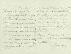 [elles étaient liées par les Guzmann] à propos de sa fille : « je tien à vous dire tout le plaisir que j’ai du séjour de Solange au Cap Martin […] je vous remercie de me la confier »… Dès que le temps sera plus clément, elles s’embarqueront et Solange la tiendra informé de leur voyage : « elle a l’esprit si ouvert aux choses de l’art et de l’histoire qu’elle jouira de les voir et les étudier. Je suis sous son charme – et désireuse de lui faire plaisir »….On joint 2 L.A.S de 1870 concernant la récupération d’effets personnels de l’Impératrice en septembre 1870, par le Prince de Metternich (10 septembre),et par le capitaine Eugène Conneau (17 sept.). Parmi ces objets : un coffret de photographies, le portrait de Napoléon III par Cabanel, le buste en marbre du Prince Impérial par Carpeaux.