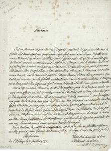 1 page in-4..Belle et rare lettre de prison..Il s’afflige des renforts de précautions autour de lui et s’en demande la cause : « C’est une illusion c’est un rêve pour moi que tout ce qui m’arrive par la fatalité d’inductions sans doute vraisemblables à vos yeux qui en trompant vôtre jugement font et mon adversité et celle d’une épouse adorable ». On lui dit que son affaire a été envoyée devant le Châtelet : « Est-ce vous, est-ce lui que je dois implorer pour obtenir le commencement de la procédure ?... me disculper aux yeux de la Nation, aux yeux de l’Univers sera pour moi une nouvelle existance, faites attention, je vous prie, que chaque jour imprime plus profondément le caractère des forfaits inouis qui m’ont été imputés par les libellistes ; […] prolonger le terme si désiré par moi de ma justification seroit confirmer en quelque sorte l’opinion générale que vous avez surement aussi à cœur que moi de voir détrompée »….[Arrêté le 25 décembre 1789, il fut condamné par le Tribunal du Châtelet et pendu le 18 février 1790]..On joint deux imprimés : Jugement en dernier ressort qui condamne à mort Thomas Mahy de FAVRAS (Paris 1790) et Acte de Foi de Madame de Favras, 4 pages in-8.