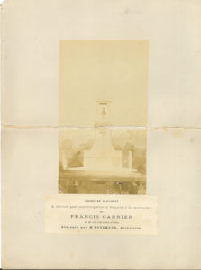 sera célébré le Mardi 22 Décembre 1874, à 10 heures très précises, en l’Eglise St Germain-des-Prés (Chapelle des Apôtres), pour le repos de l’Ame de Monsieur Francis Garnier, Lieutenant de Vaisseau, Officier de la Légion d’honneur »....[Saïgon vers 1882]. Photographie : Projet de monument à élever par souscription à Saigon à la mémoire de Francis Garnier et de ses compagnons d’armes. Présenté par M. Foulhoux, architecte. Photographie contrecollée sur papier fort, avec étiquette imprimée contrecollée dans la marge inférieure. 18,3 x 10,5 cm sur carte 32,4 x 24,6 cm (pliée au centre, traces d’oxydation). Maquette du monument qui devait être érigé à Saïgon. Le projet d’Alfred Foulhoux (1840-1892) ne fut pas retenu ; c’est celui de Tony-Noël (1845-1909) qui fut édifié (aujourd’hui disparu)..L’Indépendant de Saigon. Journal politique, littéraire, commercial et d’annonces, nos 103, 104 et 105, 29, 31 mai et 2 juin 1883 (Saigon, Imp. C. Guilland et Martinon, 1883) ; petit in-fol en feuilles (qqs petites déchirures). Ensemble de 3 numéros de ce journal, avec des articles sur la politique de la France en Indochine, la plupart en rapport avec la question du Tonkin : rôle de l’amiral Dupré qui fit partir Francis Garnier pour le Tonkin en 1873 et mort de ce dernier dans une embuscade ; traité de 1874 avec les autorités annamites ; interventions de Jules Blancsubé, député de Cochinchine, à la Chambre des Députés ; prise de la citadelle de Hanoi par le commandant Rivière en 1882 ; projet de loi sur le Tonkin, avec augmentation des forces navales, etc. Il est aussi question du projet de monument à la mémoire de Francis Garnier, par le sculpteur Tony-Noël..Provenance : archives de la famille Garnier.