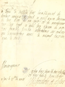 « qui me fait voir qu’elle veut prévenir mes très humbles services par des faveurs qui ne peuvent partir que de son extrême générosité laquelle matachera toujours bien plus à vostre Eminance Monseigneur que les avantages quelle me peut procurer. Ainsi elle me doit faire honneur de crere que ma fidelité sera dan touts les temps »... Il se met à son entier service et attend ses ordres avec passion...