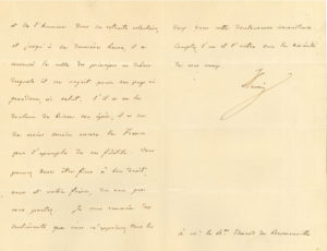 souvent entendu vanter les éminentes qualités de son aide-de-camp de Beurnonville ». Il honore à son tour « la mémoire du vieux serviteur de la monarchie par un témoignage de sympathie et de reconnaissance. Le Colonel du 6ème régiment de la garde royale a été dans sa vie militaire le modèle du dévouement et de l’honneur. Dans sa retraite volontaire, et jusqu’à sa dernière heure, il a conservé le culte des principes en dehors desquels il ne voyait pour son pays ni grandeur, ni salut. S’il a eu la douleur de briser son épée, il a su du moins servir encore la France par l’exemple de sa fidélité ». Le baron et son frère peuvent être « fiers du nom que vous portez »….On joint une copie d’époque de la proclamation du comte aux Français, le 25 octobre 1852.