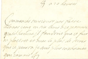 Françoise d’Aubigné, marquise de MAINTENON. L.A., signée d’un paraphe, 10 heures ; 1 page oblong in-12..Billet pour faire donner 5 ou 6 louis à un pauvre gentilhomme, « avec le plus de secret qui se pourra »... Elle est « plus...