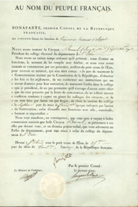 Hugues Maret, secrétaire d’État ;1 page grand in-fol. en partie imprimée, en-tête Bonaparte, Premier Consul de la République Française, sceau sous papier (lég. rouss.). .Nomination du citoyen Joseph M. Barral, Président du Tribunal d’appel, comme « Président du collège électoral du département de l’Isère. Nous avons en même temps ordonné qu’il prêterait, avant d’entrer en fonctions, le serment de les remplir avec fidélité »…