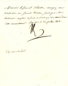 NAPOLÉON Ier. L.S. « Nap », Bayonne 21 juillet 1808, au général Clarke ; la lettre est écrite par Méneval ; demi-page in-4..« Témoignez ma satisfaction au General Devaux sur la prise du batiment anglais & sur la conduite qu’il a tenue...