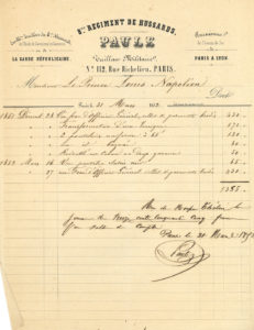 commerciaux..Factures et mémoires pour le Prince-Président. Mémoires et reçus de tailleurs (Blain, Dusautoy, Paule et Delpoulle…), ébénistes, tapissiers, confiseurs, maroquiniers, parfumeurs (Houbigant), pédicures, coiffeurs (Bernard), bottiers (Devaux, Schumacher, Vogel), etc. Fourniture d’une batterie de cuisine, cigarettes et cigares, éperons, produits de soins médicaux ou d’entretien ménager ; listes détaillées de dépenses pour le port de lettres ou frais de douane, bains (Bains de Tivoli)...